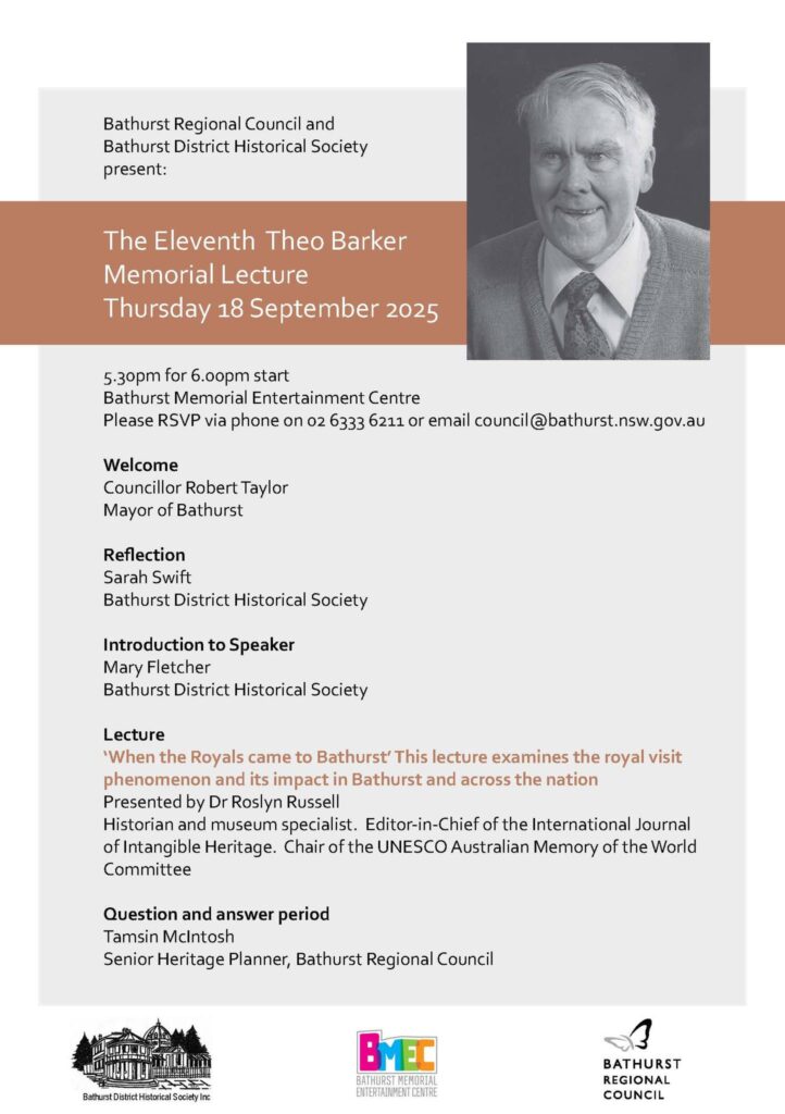 The 2025 Theo Barker Lecture, sponsored by Bathurst Regional Council and the Bathurst and District Historical Society, is being held on Thursday 18 September 2025. The lecture is in memory of Theo Barker, a much loved and respected member of the Bathurst community. Theo was Bathurst’s historian, the author of many publications and a popular speaker on Bathurst’s history.